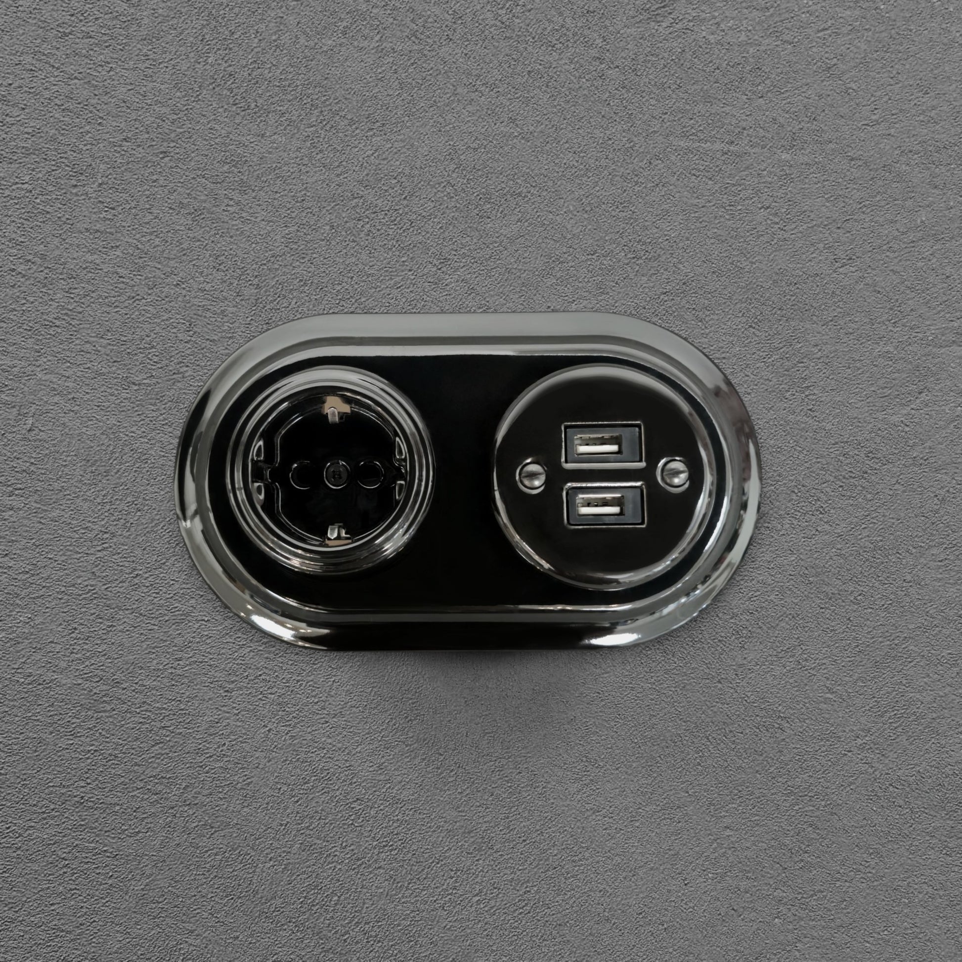 Retro Style Black Ceramic German Schuko And 2xUSB Charging Socket SET Flushed-Mounted