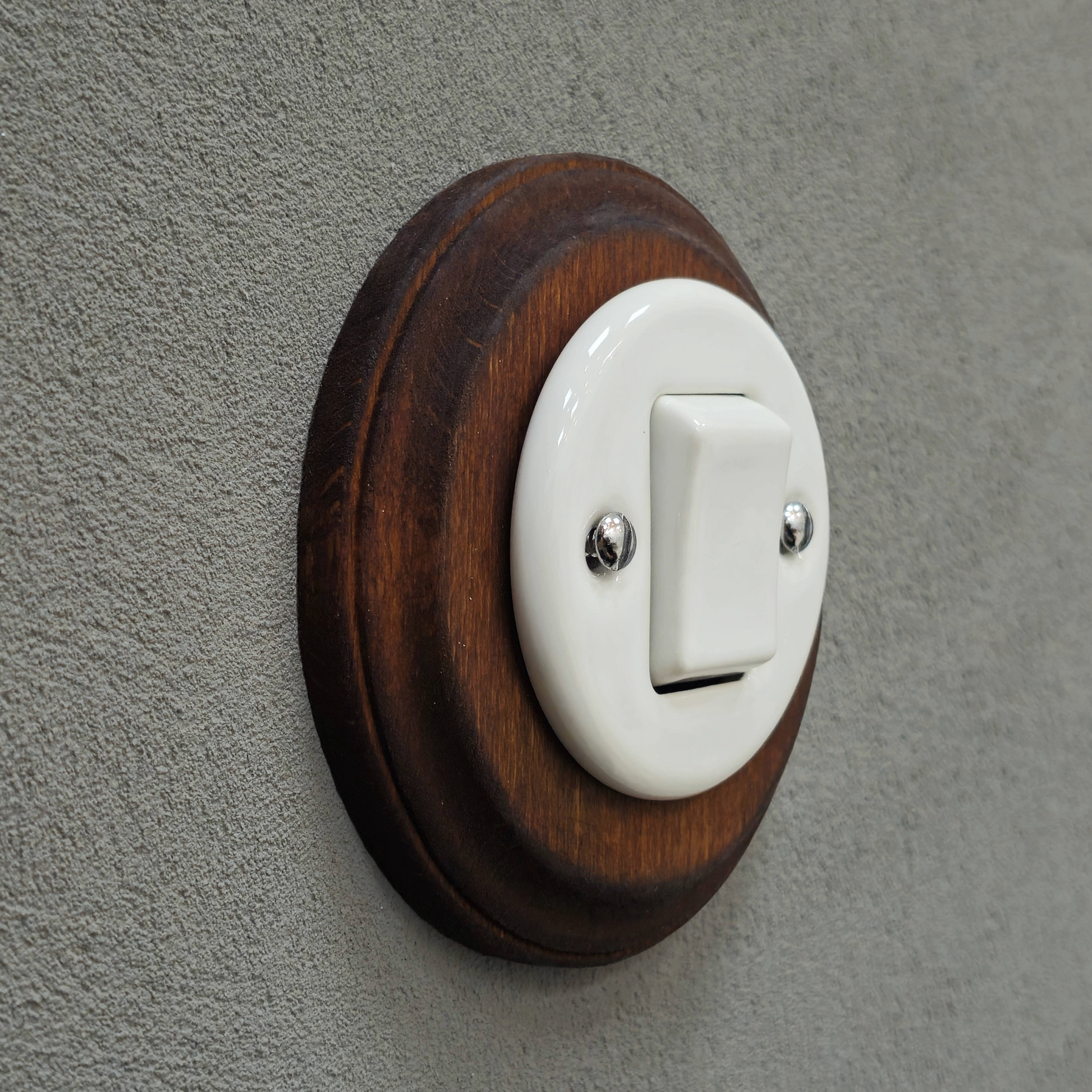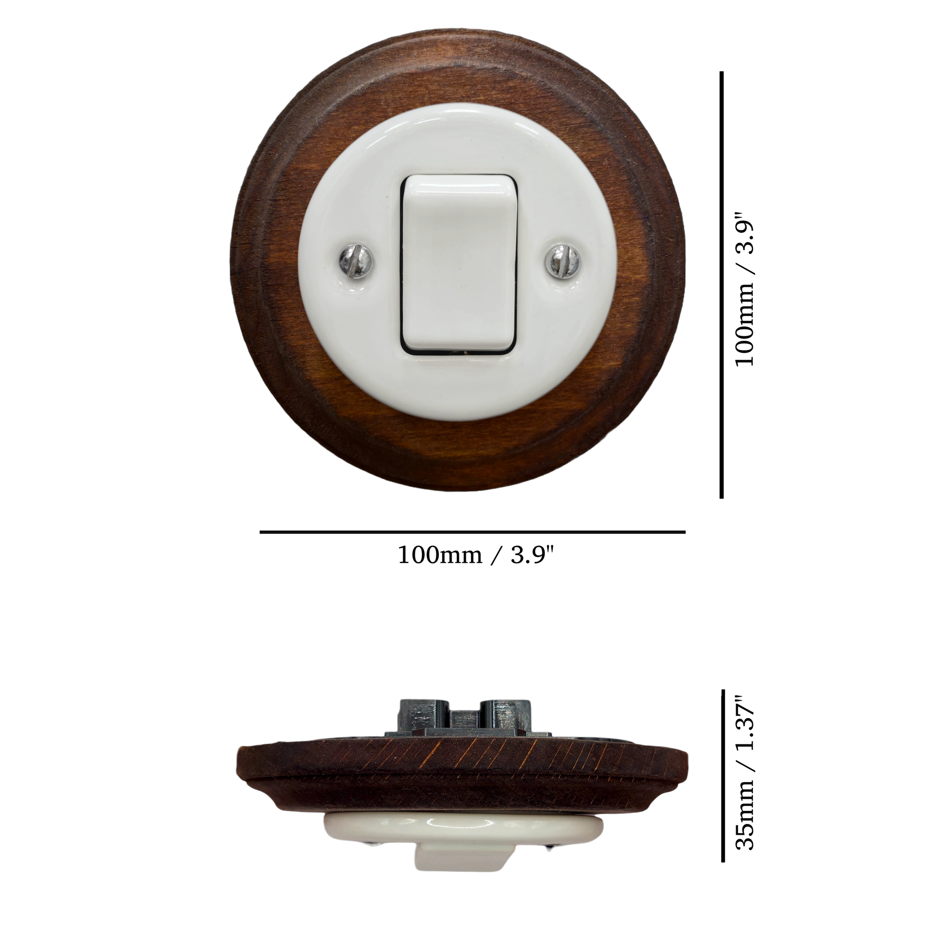 Retro Style White Ceramic Crossing Push Button Switch Flush-Mounted Dark Wood Frame, D100mm