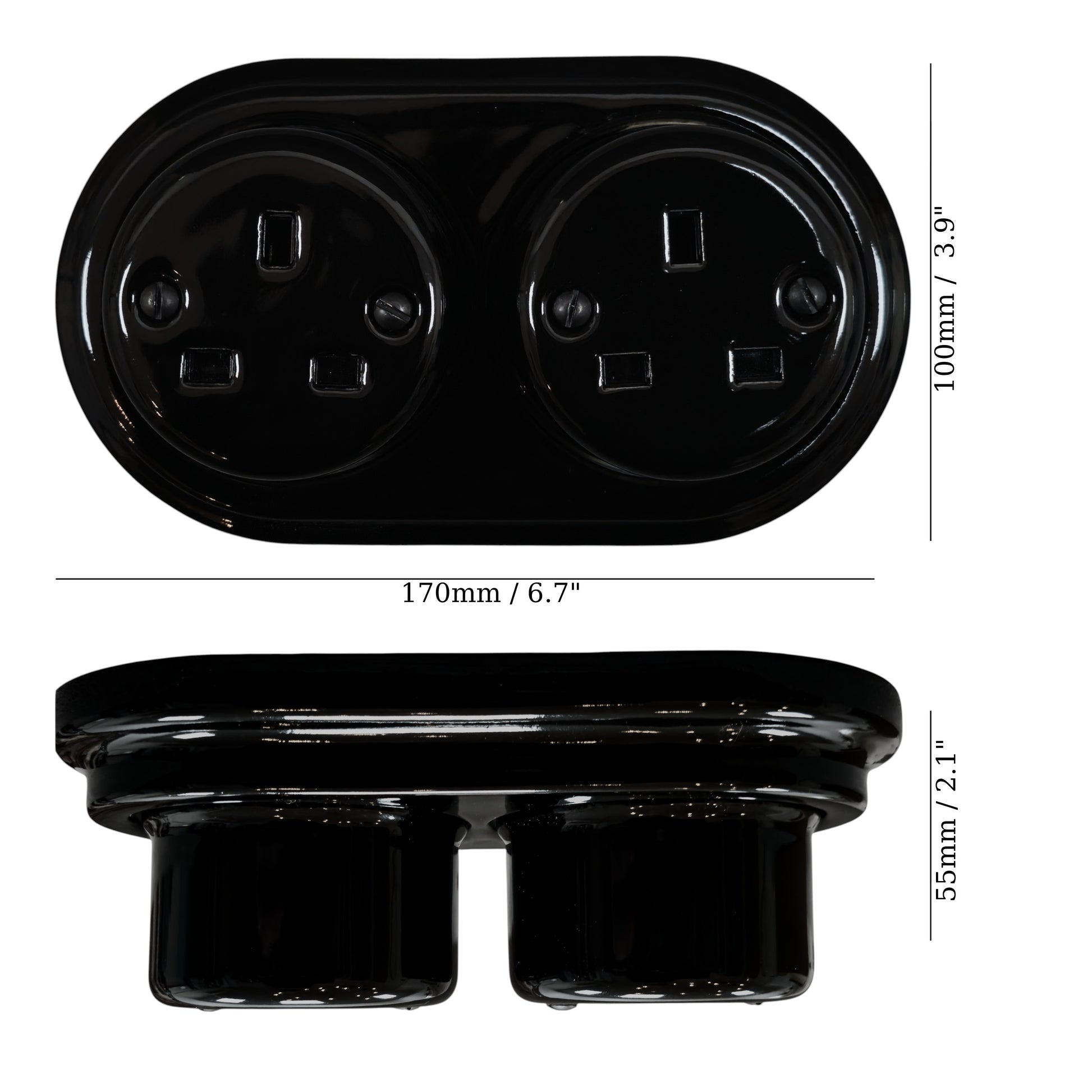 Surface Mounting Double Power Socket Porcelain Loft Retro Electrical UK 3 Prong Surface Mounted Vintage Cottage Ceramic Black
