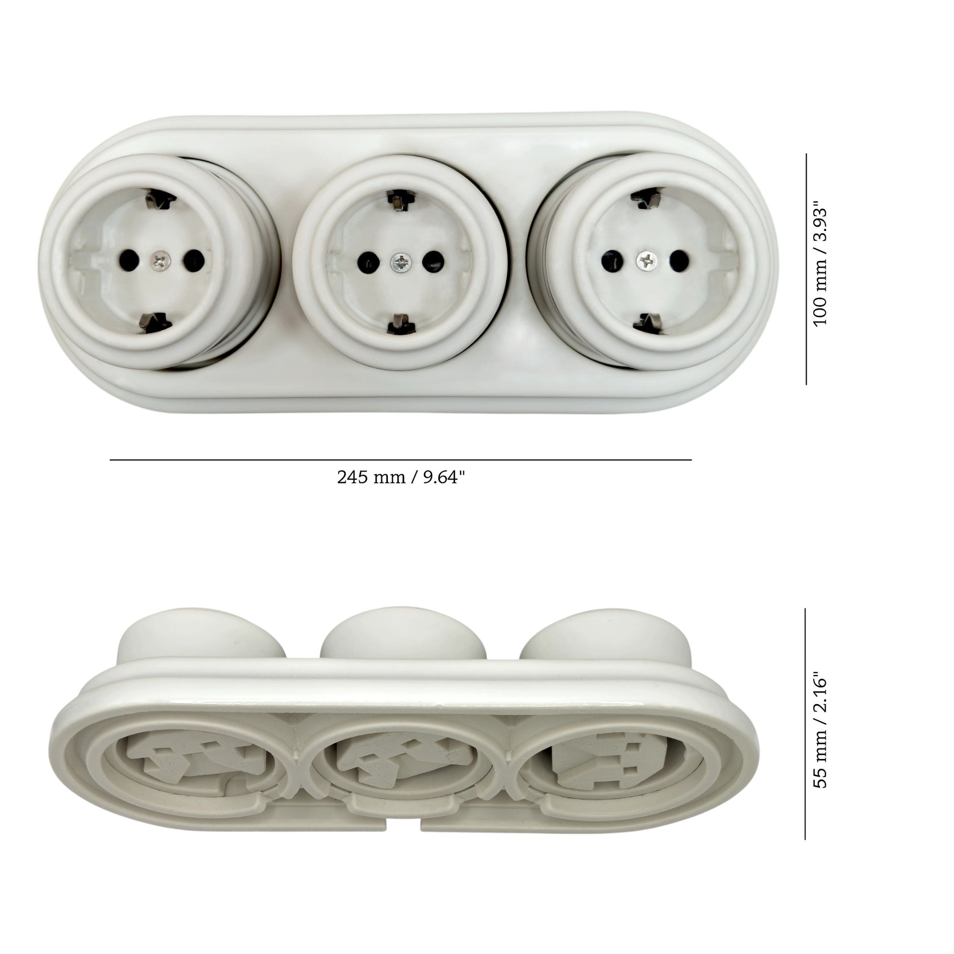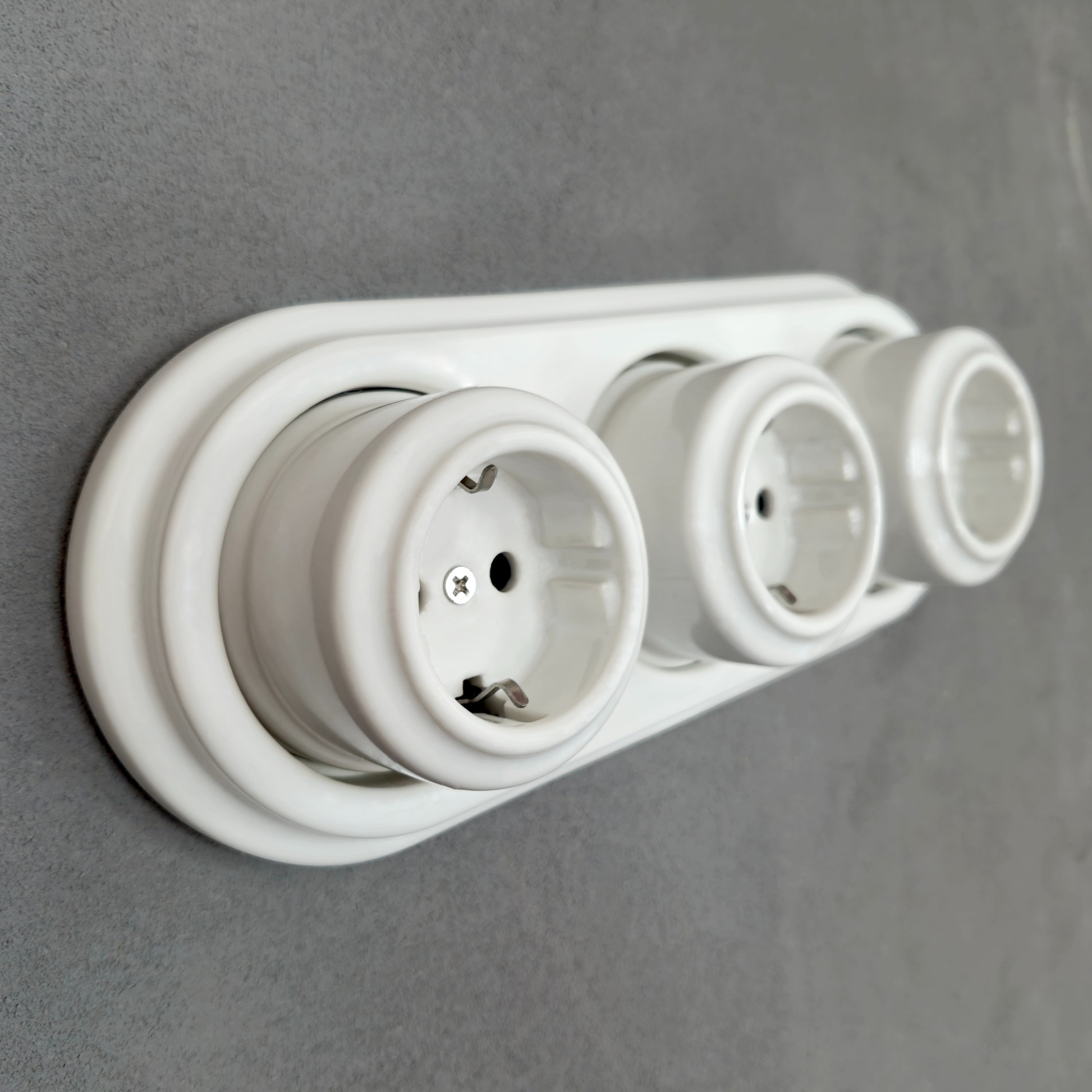 Retro Style White Ceramic Triple German Schuko Socket Surface-Mounting Childproof