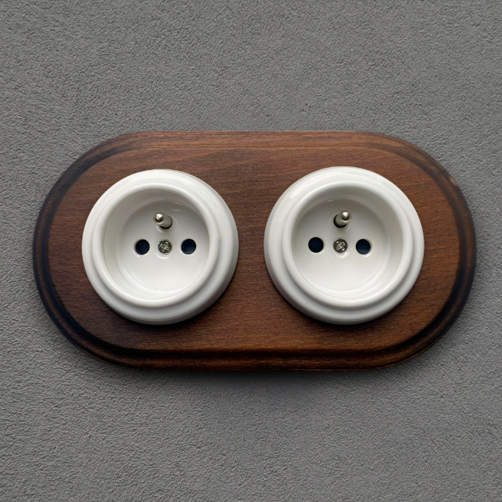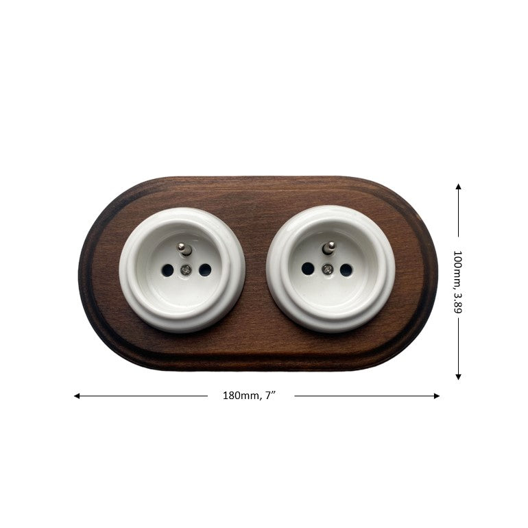 Wooden Frame Double French Power Socket Porcelain Loft Retro Electrical Flush-Mounting Vintage Cottage Ceramic Dark Brown With White